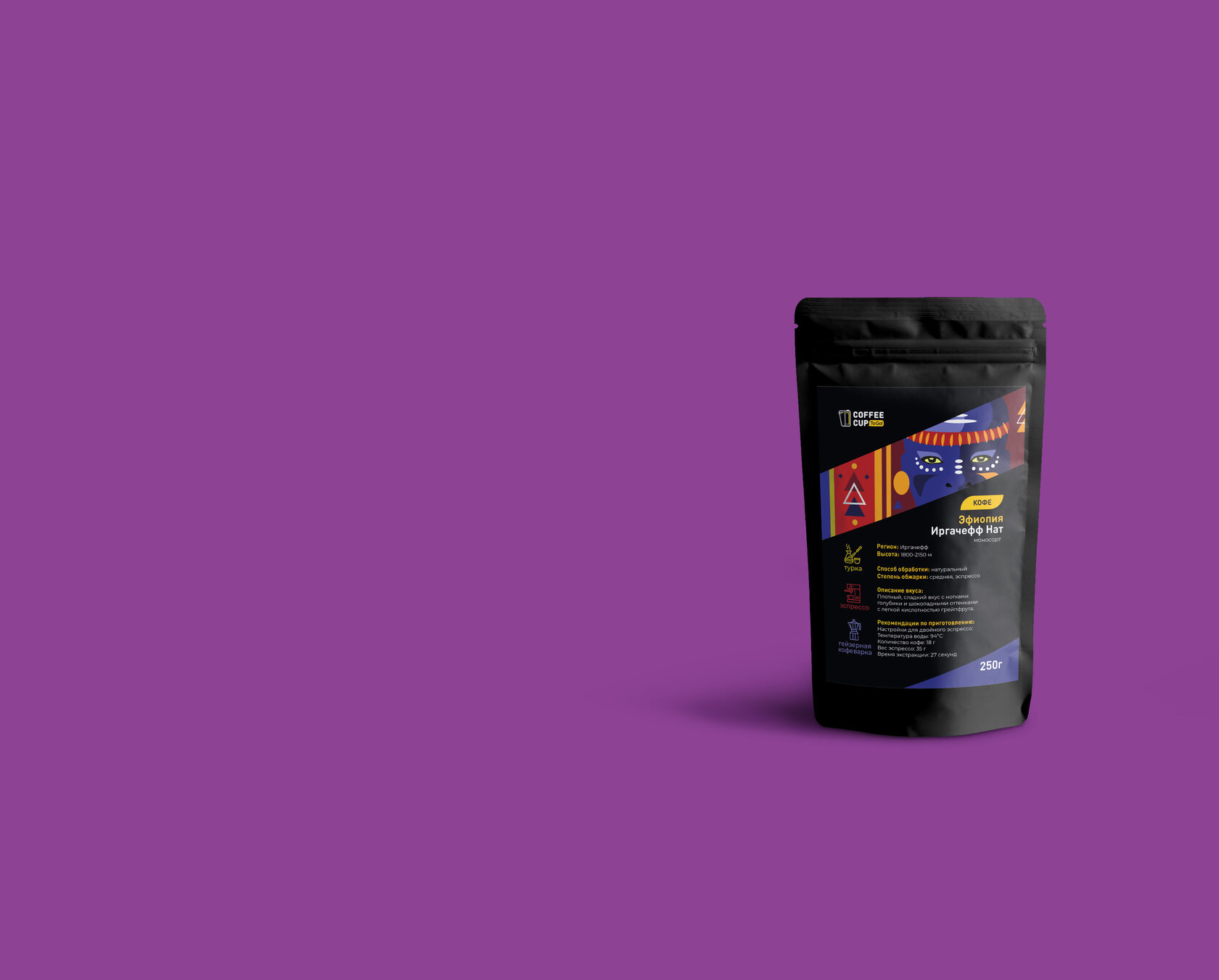The coffee packaging is branded on a black doypack bag with a zip-lock.