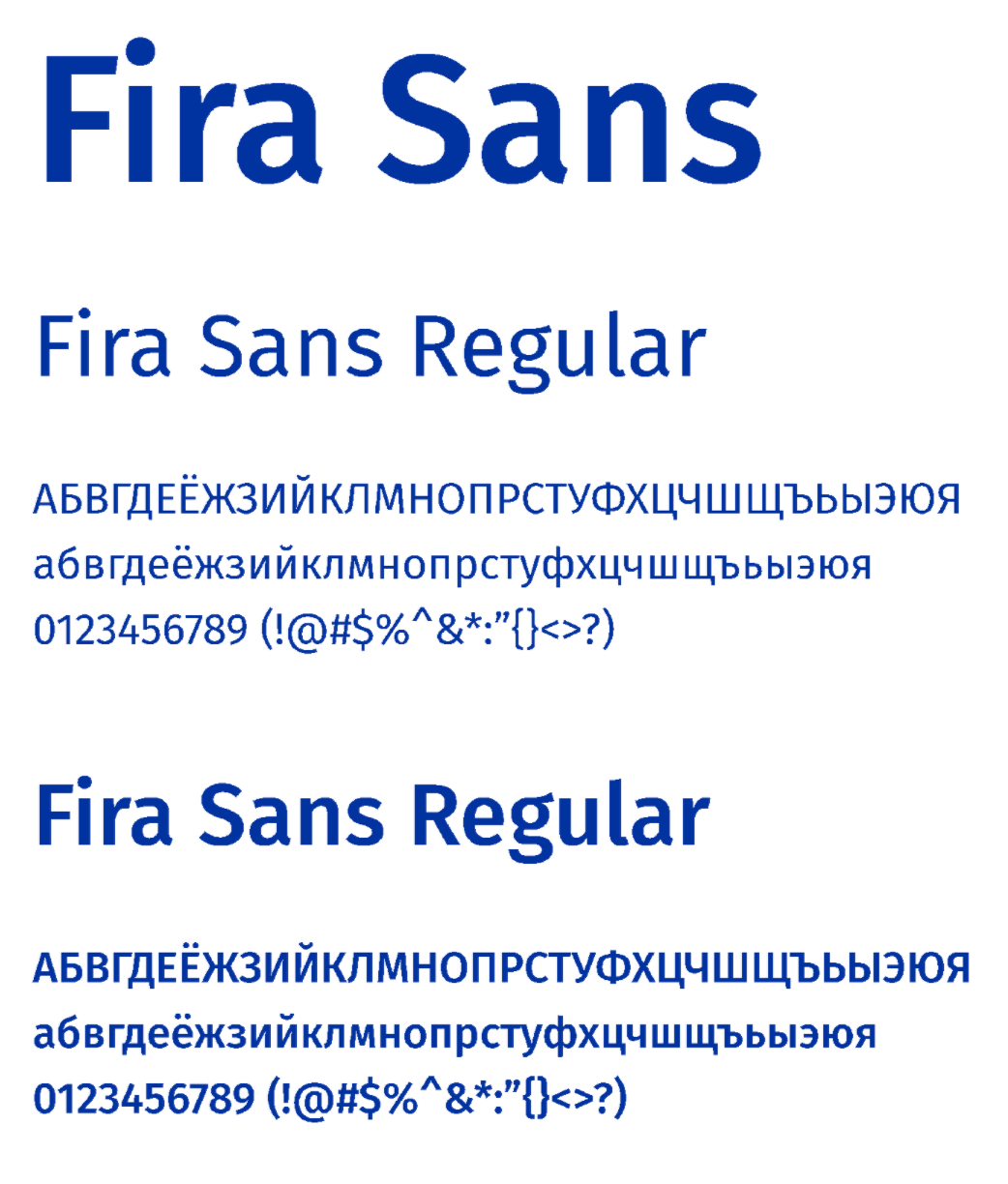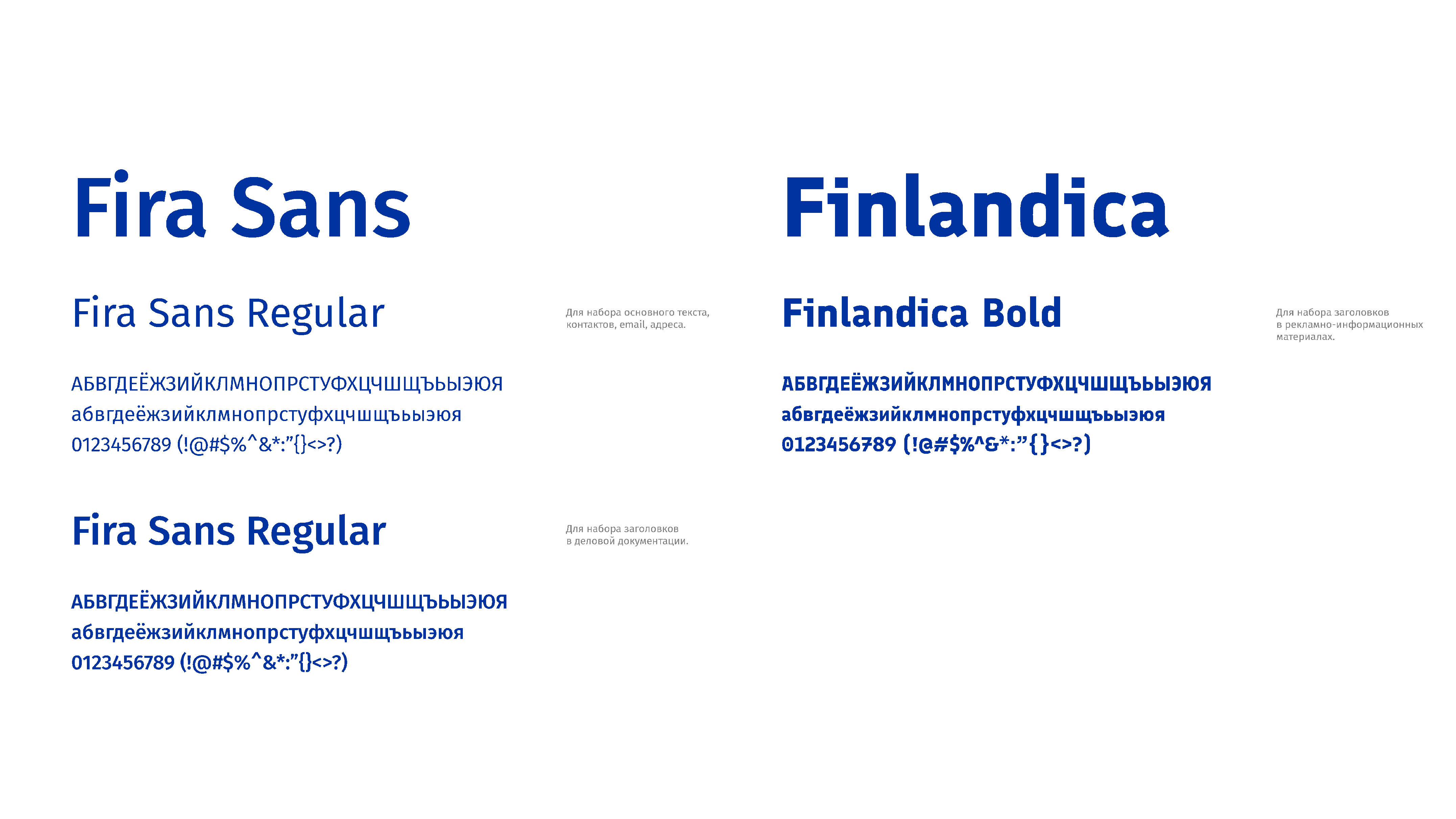 Систематическое использование фирменных шрифтов способствует повышению узнаваемости бренда. Два начертания Fira Sans и Finlandica применяются для ведения всей деловой документаци как корпоративный шрифт, для рекламно-информационных материалов, а также при наборе текста для любых других носителей коммуникации.